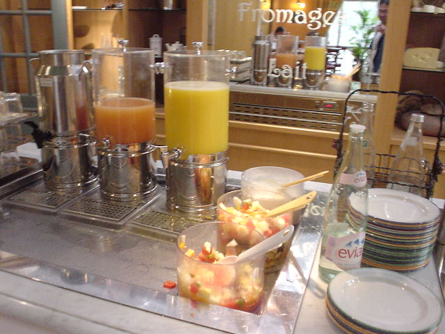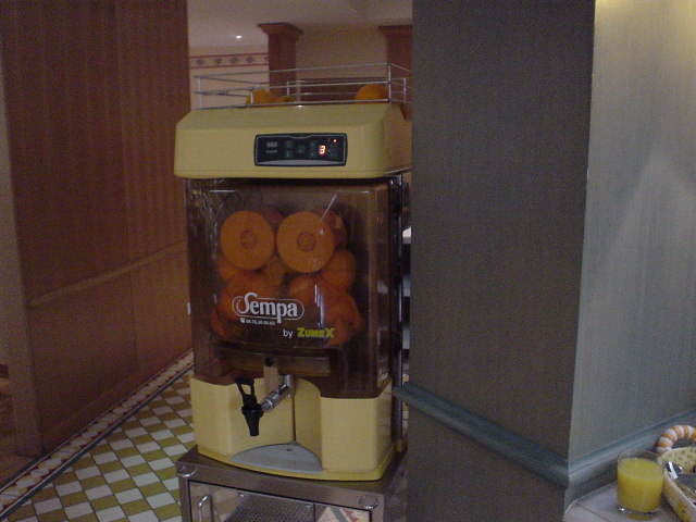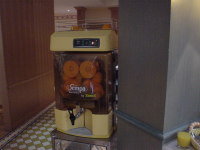 | オレンジの自動絞り器タイプのジューサー。 コップ半分位しか出なかったので適当にボタンを押したら オレンジかドンドン吸い込まれていった。 ヤバイと思いその場を早急に立ち去る。 |