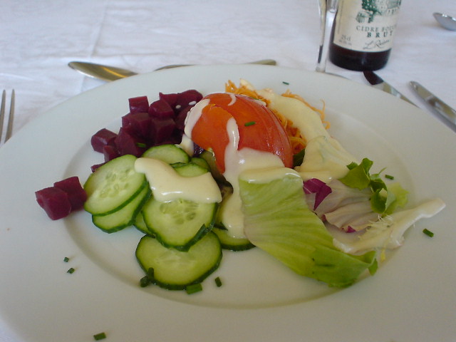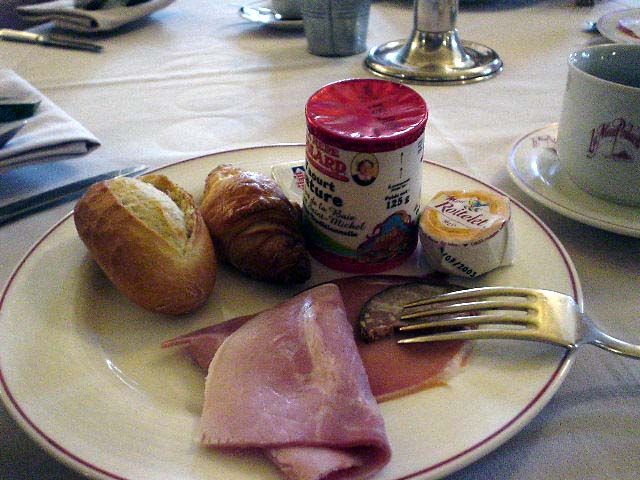 | 朝食です。 特筆するのはモンサンミッシェルマーク入りヨーグルト! 私はプレーンを食べましたがチョコタイプを食べたヒトは相当甘かったらしい。 |