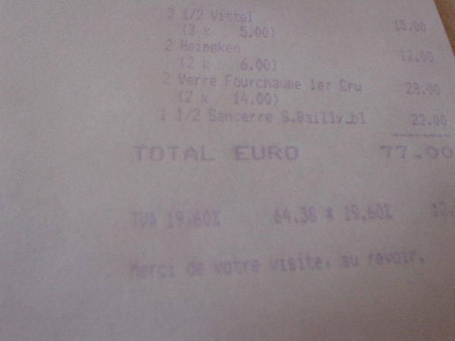 | 本日のワイン Verre Fourchaume 1er cru 14ユーロ ここのソムリエらしいヒトの抜栓技術は凄かったです。 流れるような手つきで音もなく栓を抜いていく・・・スゴイ! |