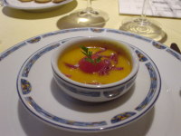 | ますはメロンと生ハムのスープ 初体験のお味・・美味・・生ハムメロンと同じですなぁ。 |