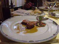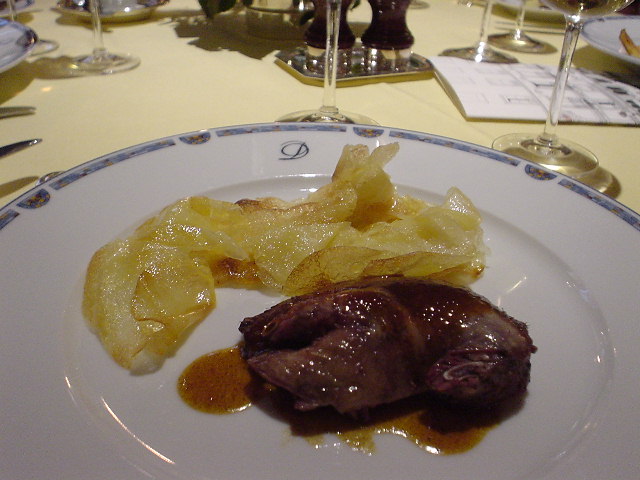 | コースAの肉料理は鳩のロースト 鳩はハジメテ食べました。 鴨の歯ごたえでレバーの味ですなぁ・・・。 渋いワインが無いと辛いよ。 |