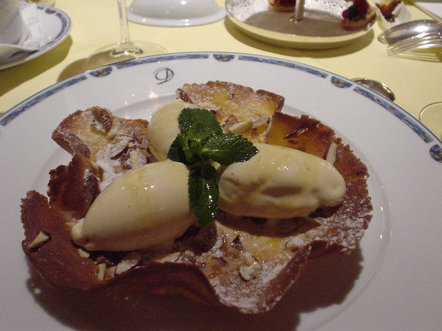 | 締めの手前にアーモンドガレットに載ったキャラメルアイスクリーム。 旨いけど甘さで頭がクラクラしてきた。 ガレットのサイズはヒトの顔くらい有る大きさです。 コイツは全部食べられず・・・ |