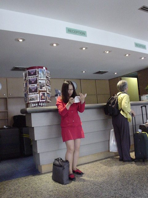 | 空港行きの迎えのバスが来る。 しかし、乗車予定の4名中1名(私)しかホテルに居ない? あせる、係のお姉さん。 結局、2名はキャンセル済みで1名は遅れて来ました。 |