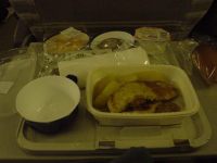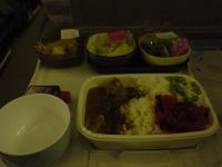 | 相変わらず不味い機内食 (-_-メ) チキンカレーですが・・サトウのご飯とボンカレーの方が 数段ウマイです。 JALの機内食って試食してるのだろうか? スッチーは絶対にコレは食べてないな。 |