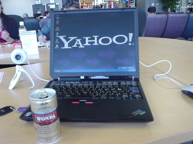 | ナゼか缶コーヒーが呑みたくなって売店で購入して YahooCafeへ突撃。 日本へ帰ってきてホッとしていたら、隣の外人さんに 英語で話しかけられてビビる。 どうやら、キーボード入力すると漢字変換してししまい 困ってるみたい。 日本後モードを外してOKサインがでる。 |